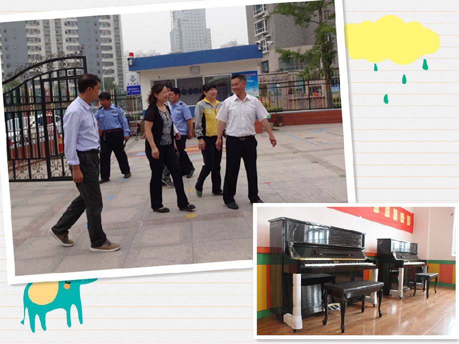 为进一步改善幼儿园办学条件,为孩子们的全面成长,有效促进学前教育的发展 ,2014年5月19日上午,潍坊市经济开发区文教局张曰金局长、学前科王爱东科长等一行,在集团张玉臻书记的陪同下到仁和分园实地捐赠了总价值近万元的钢琴两架。张局长在捐赠过程中详细了解了我园进期的发展及师资配备情况,对于园内的工作给与了充分的肯定,并积极鼓励广大教职工努力提高自身素质,为幼教行业做出应有的贡献。