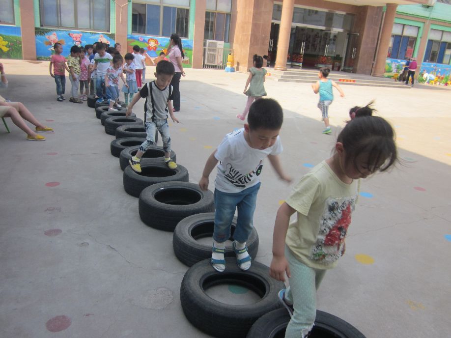 5月22日下午,市直机关幼儿园文化路分园中三班的小朋友在老师带领下进行了户外有趣的轮胎小游戏。