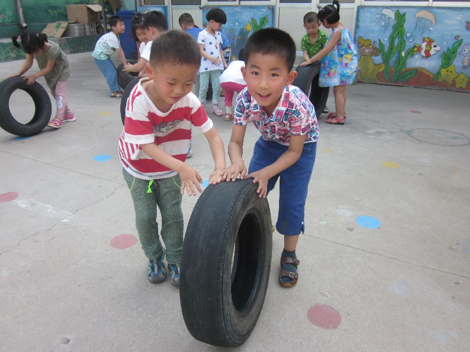 轮胎一直是孩子们喜爱的户外玩具之一,对中班的小朋友来说,轮胎具有一定的重量,并且在滚动的过程中需要孩子保持平衡和控制方向。既锻炼了孩子的臂力,又练习了幼儿的平衡能力,轮胎具有柔韧性,对幼儿来说比较安全。中三班的孩子们在游戏的过程中不断创新,想出了各种有趣的玩法,例如把轮胎排成一排,孩子们一个接一个“过桥”,还有小朋友两人一组坐在轮胎里,俨然一副划船的姿态。这个过程中孩子们学会了创新,学会了合作,一下午的大汗淋漓,一下午的欢声笑语。