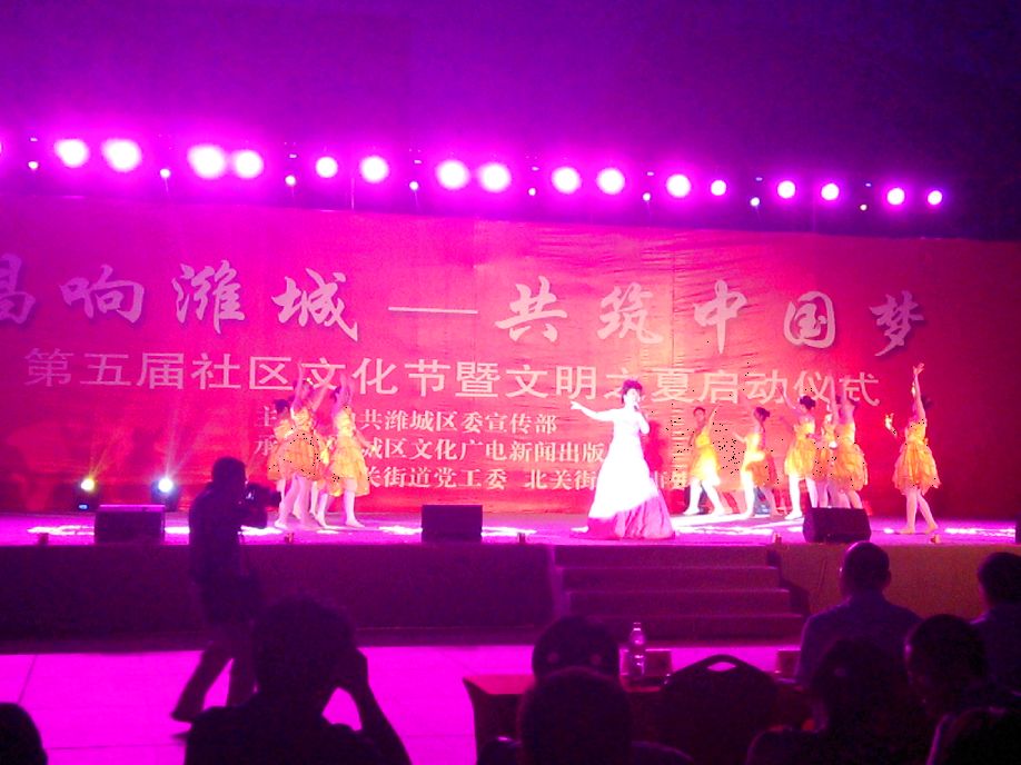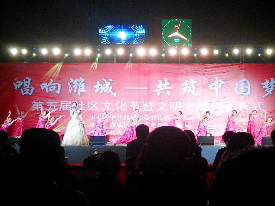 2014年5月27日晚7点30分,由潍城区委宣传部和潍城区文化广电局联合举办的第五届社区文化节暨文明之夏启动仪式在潍坊市奥体中心拉开了帷幕。我们潍坊市机关幼儿园青鸽艺术团的老师们分别代表乐埠山生态经济发展区和潍坊市机关幼儿园乐埠山分园参加了演出,现场气氛热烈,赢得了场下领导和观众的阵阵掌声,受到了潍城区委和街道办事处领导的一致好评!