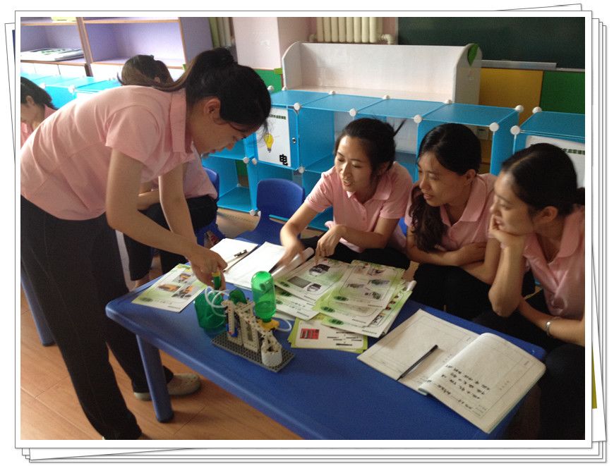 教师们积极参加材料的组装和内容培训,理论结合实践,从幼儿的接收和发展的角度出发,通过动手操作体验和交流讨论,了解了磁、电、光、力、空气、水等现象的原理。