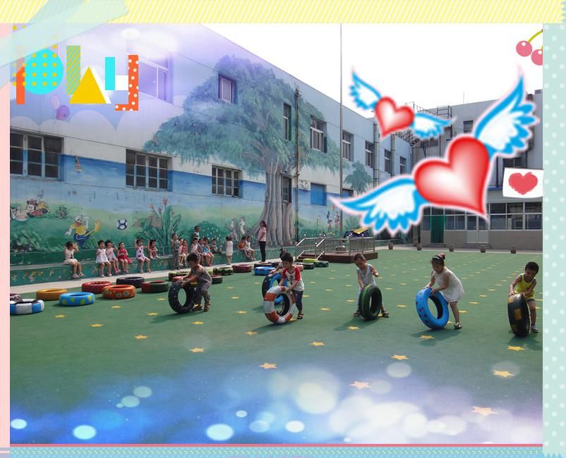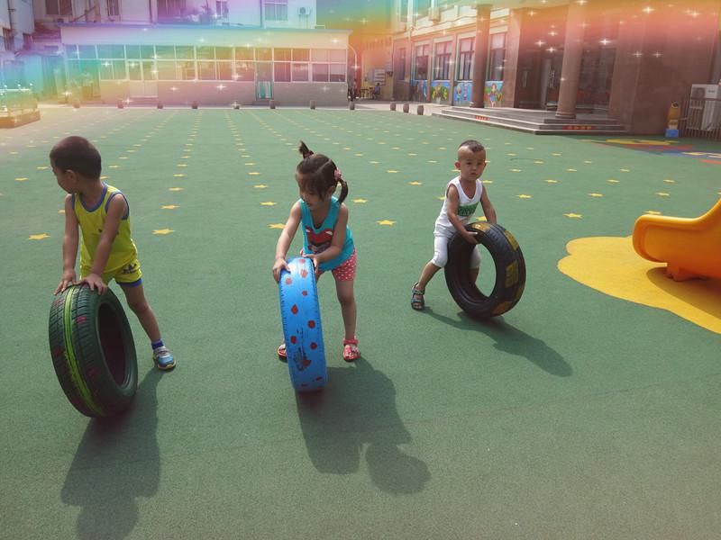 阳光普照,激情四射,瞧!崭新的塑胶地上孩子们玩得热火朝天,原来他们有了新朋友——轮胎。
