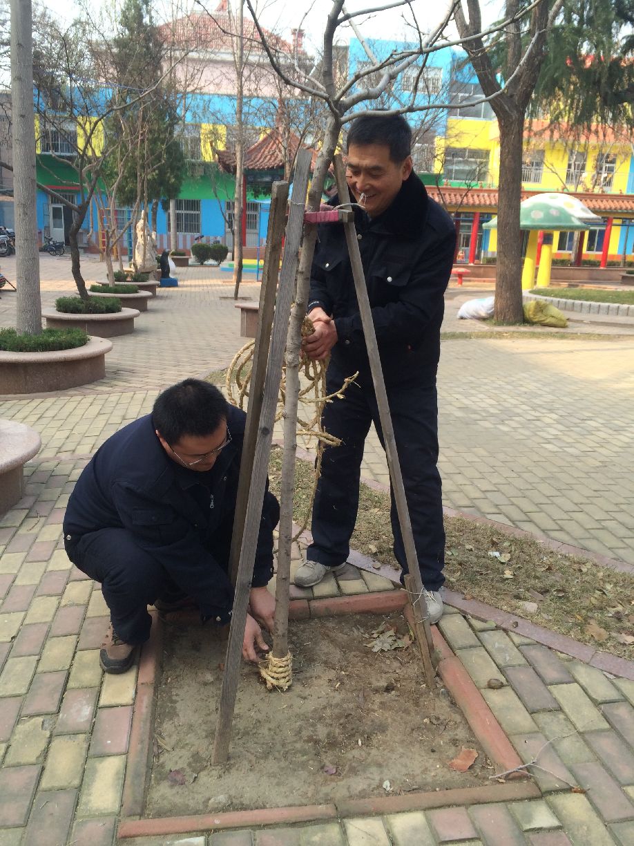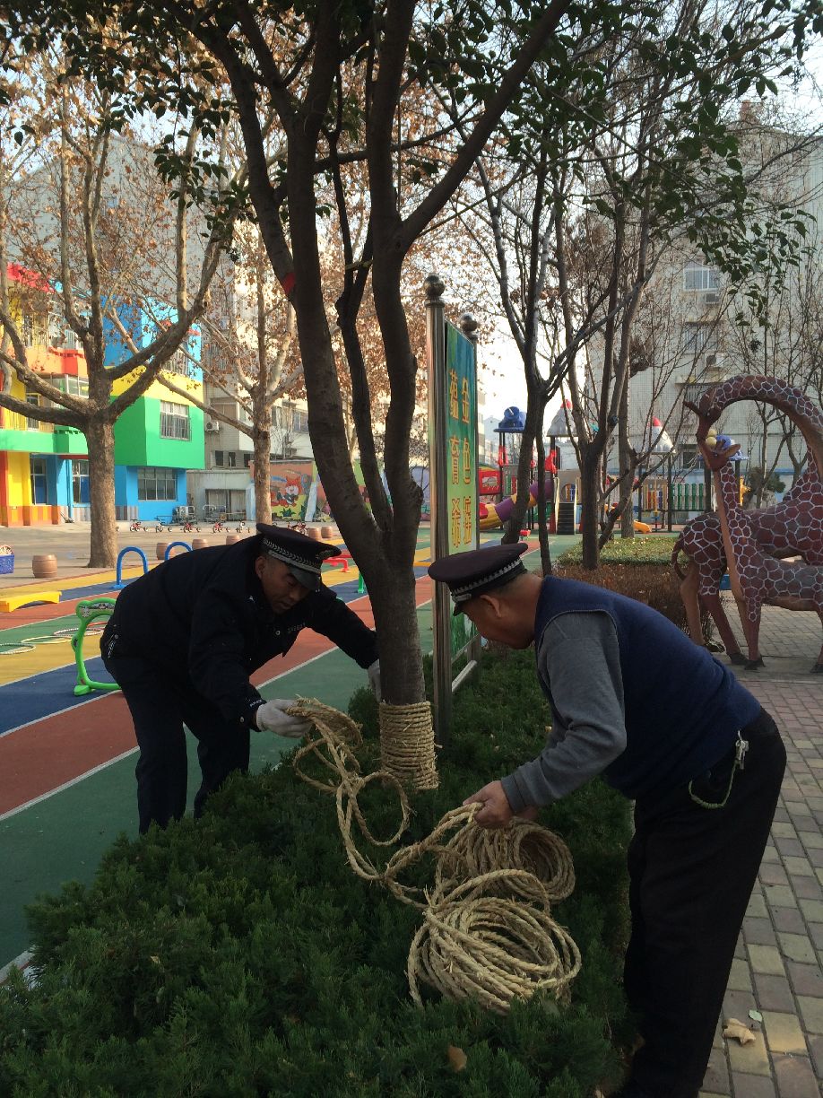 潍坊市机关幼儿园行政街园为确保园内花草树木安全过冬,2014年12月8日上午,栾凤强主任带领保安师傅们给园里的花草树木进行了修剪并给它们“穿上了棉袄” 。