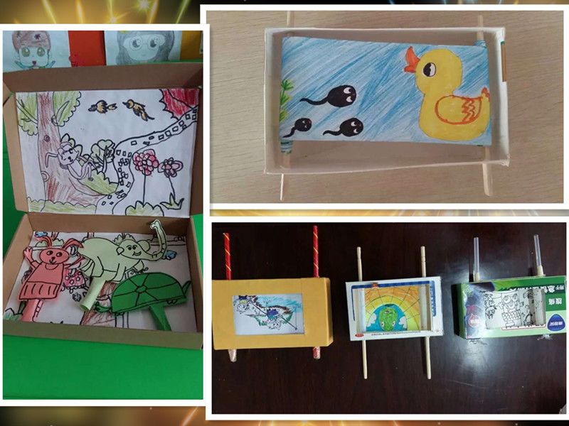 特别是家长与孩子一起亲子制作的故事盒子和小电影:故事盒子是根据孩子阅读到的故事情节,加以自己的理解与想象,与家长一起用各种彩笔、彩泥或者加入一些废旧物品做成的一些故事情节再现,有的粗糙,有的精美,甚至有的惟妙惟肖。而手工“小电影”是借助很小的一个纸盒,中间放上孩子的故事绘画,两边用塑料管或小木棍卷动,就成了会动的图画故事小电影,有点接近于电影的早期雏形“拉洋片”,让人感觉特别有创意,家长的智慧与支持让人感动,家园合作在这里得到了充分的体现。