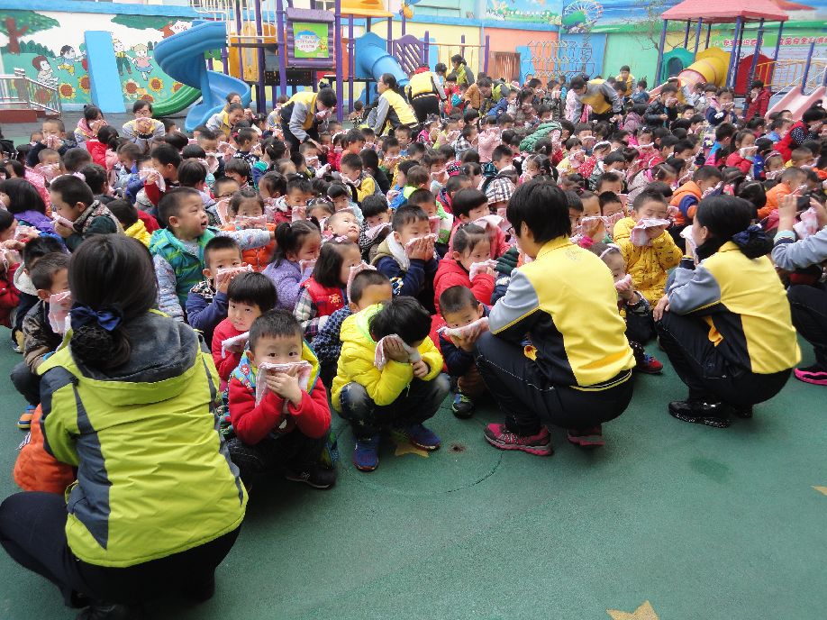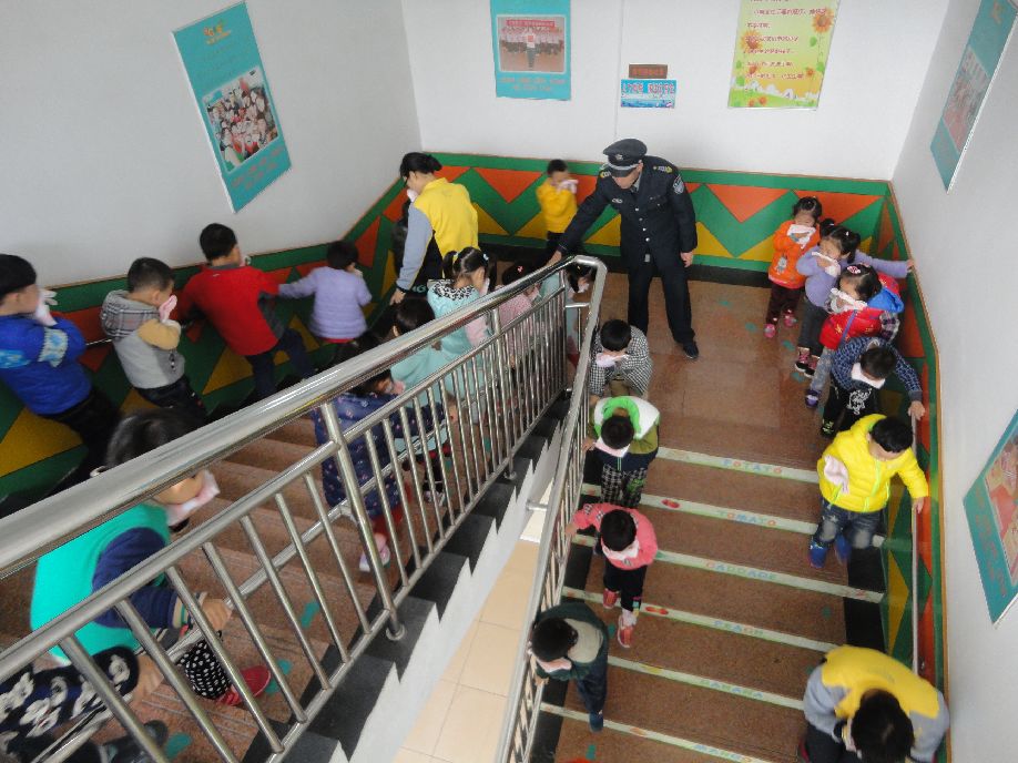 3:30分,孩子们正在专心地上课,忽然听到紧急的警报声,各班教师迅速组织幼儿拿起毛巾,捂住口鼻,迅速有序的下楼。很快孩子们集中到操场安全地带,教师迅速地清点人数,并向总指挥报告。演练结束后,由保安人员演示了正确使用灭火器灭火的方法。