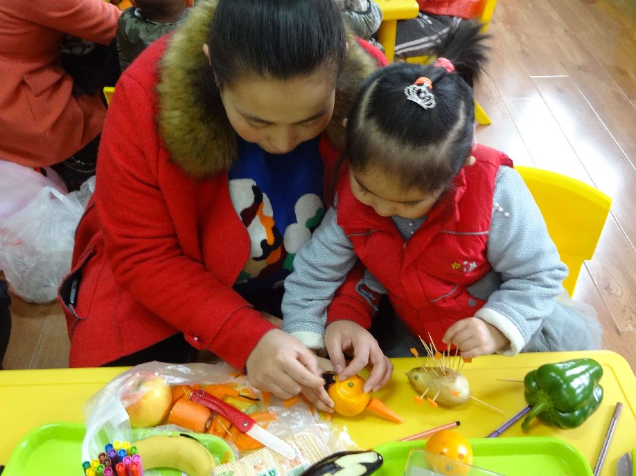 活动中家长和孩子们分别将带来的水果和蔬菜,经过巧手打造,变成了精致的玩具胡萝卜飞机、茄子轮船、桔子毛毛虫,还有一幅幅精美的果蔬风景图画。有的家长带着图片对照着制作,有的家长干脆拿出了手机现时网上查询制作方法。孩子们一边高兴地吃着水果,一边兴高采烈的帮忙制作,浓浓的亲子氛围溢满了整个教室。