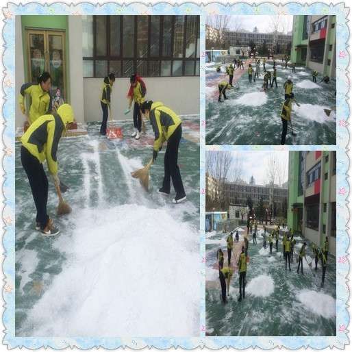 一场突如其来的雨雪迎来了潍坊市机关幼儿园北海园2016年新学期第一个忙碌的清晨。经过一夜的沉积,幼儿园里银装素裹,分外妖娆,成了白色的世界,显得别有一番风味。瑞雪迎新带来节气喜悦的同时,也造成了园内的诸多不便。2月14日一大早,我园立即启动“北海园冬季除雪应急预案”,在刘宁园长的带领下,所有教职员工积极投入到积雪清扫之中。