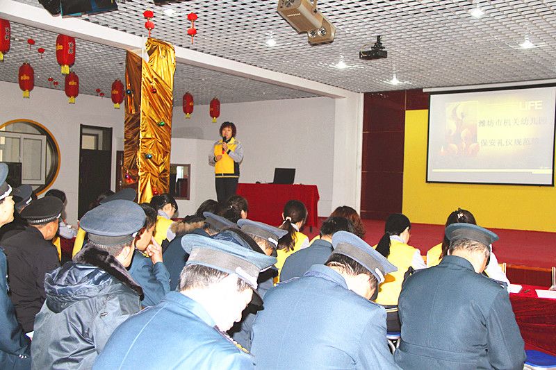 为加强幼儿园的安全管理,提高幼儿园服务质量,打造一支素质优良、作风过硬的幼儿园保安队伍,2016年2月27日,潍坊市机关幼儿园安保部联合兴安保安公司,举行了“幼儿园保安礼仪规范”培训活动。