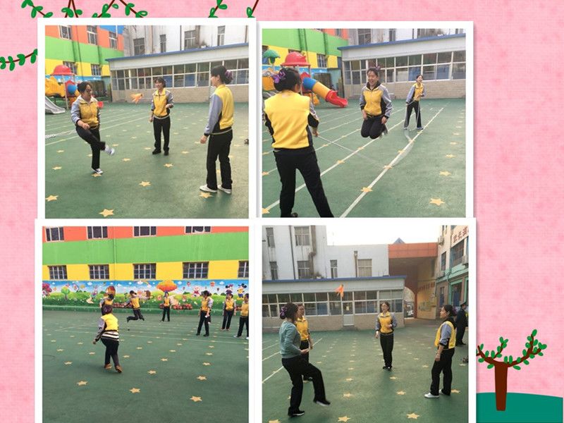 各园每周自选两天早晨或是下午孩子不在园的时间作为锻炼时间,各园里锻炼的项目也不尽相同,有的组织丢沙包、打羽毛球、跳绳;有的组织集体健美操;有的引进新项目,邀请高智尔球培训中心的专家对园里教师进行高智尔球运动课程培训指导……各园的操场上到处洋溢着老师们锻炼过程中开心的笑声,此时的他们忘却了一天的辛苦,尽情的释放自己的青春与活力。他们的活动的身影和愉快的欢声笑语勾画出潍坊市机关幼儿园的一道亮丽的风景。