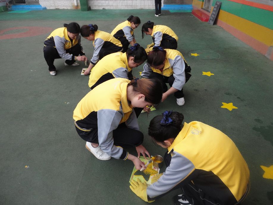 经过青年团老师们的辛勤忙碌之后,幼儿园操场卫生焕然一新,金色的星星也显得格外灿烂,相信孩子们在这样优美的环境里,一定开心快乐,平安健康的度过美好童年的每一天。