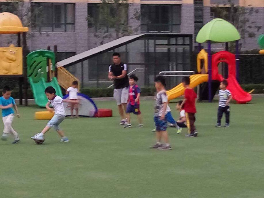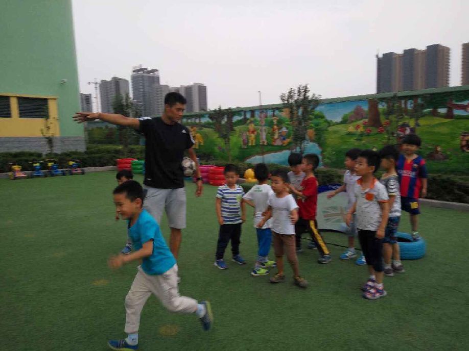 绿茵茵的操场上,一群勇猛的足球小子在教练的带领下,助跑、踢球、射门,勇猛冲刺,冲锋陷阵。