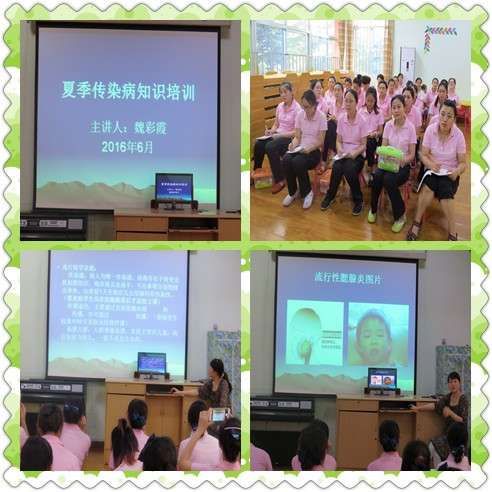 本次培训着重“手足口病”、“水痘”、“麻疹”、“咽颊炎”等传染病,通过图片展示和案例讲解,使教师进一步了解幼儿夏季传染病的发病症状、传播途径、鉴别诊断、预防措施及病儿护理知识,使大家认识到日常卫生工作和幼儿卫生保健教育的重要性。并强调教师在日常活动中要做好晨午晚检、消毒、卫生、通风等工作,加强幼儿户外体育锻炼,增强幼儿对疾病的抵抗能力。幼儿户外活动的同时,保证幼儿每天充足的饮水量,引导幼儿随时补充水分。