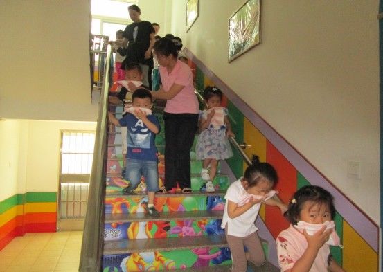 随着警报响起,各班教师带领幼儿,半蹲身体,口捂毛巾,顺着楼梯有序地撤离了火灾现场。演练过程中,教师沉着冷静,分工明确,幼儿紧张有序,炊事员在重要位置维持秩序,整个过程用时4分钟。