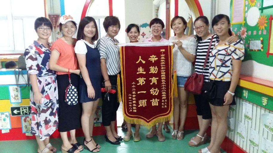2016年8月16日一大早,潍坊市机关幼儿园仁和分园小小二班教室门口就传来了一阵欢声笑语,只见一群家长围着两位老师递上了一面鲜红的锦旗,上面写着“辛勤育幼苗,人生第一师”,小小二班全体家长赠。