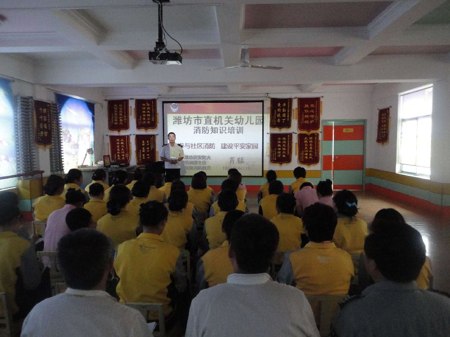 为了增强教职工的安全意识,具备防范、自救能力,9月28日中午,我园特邀潍坊市居安防火中心的肖教官来园为大家进行了安全知识培训。肖教官用生动的案例给大家讲解了消防安全工作的重要性,以一些真实惨痛的火灾案例为切入点,从煤气、用电安全、乘坐公交车安全、消防器材的使用等方面进行了阐述,重点对火灾发生的原因及发生火灾后的逃生技巧方法进行了讲解。