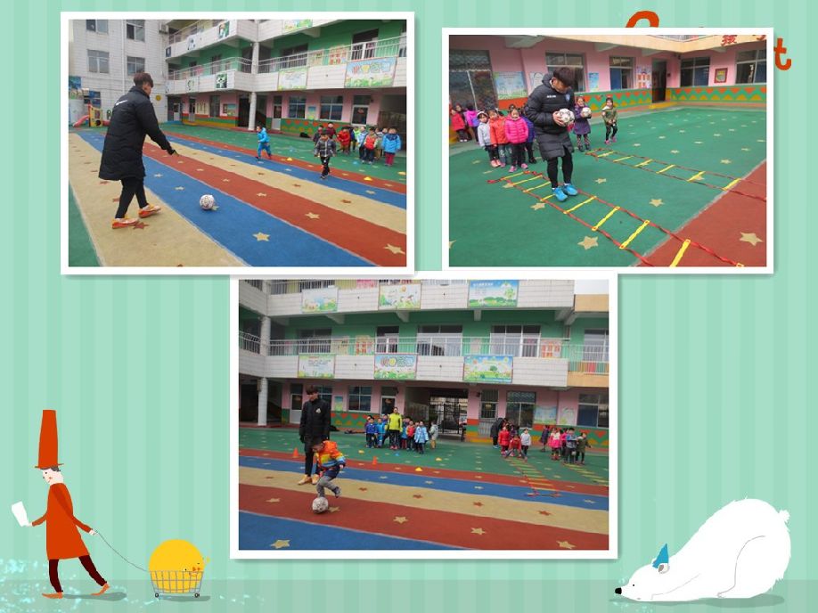王教练为了照顾到更多的孩子,满足他们的兴趣,让他们玩的更开心,还邀请了足球俱乐部里的助教---赵教练。两位教练带领孩子们一一进行了热身活动——带球游戏——进球游戏——放松运动,不仅创设了孩子们容易接受的情境,而且还激发了孩子们对足球的热爱。