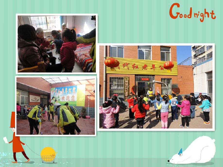 老师带领孩子们到养老院开展了以“尊老、敬老、爱老”为主题的爱心活动。孩子们在老师的带领下,排着整齐的队伍,唱着欢快的儿歌,一路走进养老院。孩子们一声声奶奶节日快乐,让老人们感到无比的激动,孩子们还为爷爷奶奶表演了精彩的节目,并送上亲手制作的节日贺卡。