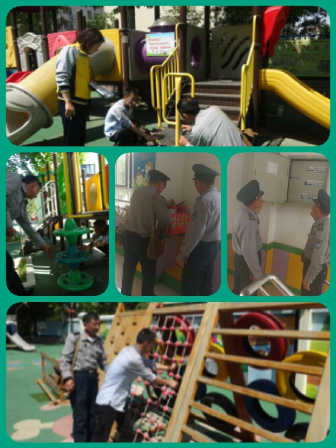 安全工作是一切工作的重中之中,为了保证幼儿在园各项活动的安全开展,机关幼儿园北海园于5月中旬,由安全领导小组成员与保安师傅以及大型玩具的厂家检测技术员一起,对全园的大型玩具、消防设施、电路、插座以及班级的桌椅床凳以及门窗等设施设备进行了一次全面的安全隐患排查,对于排查出的安全隐患及时进行了处理,消除了存在的安全隐患,保证了孩子们各项活动的安全开展。