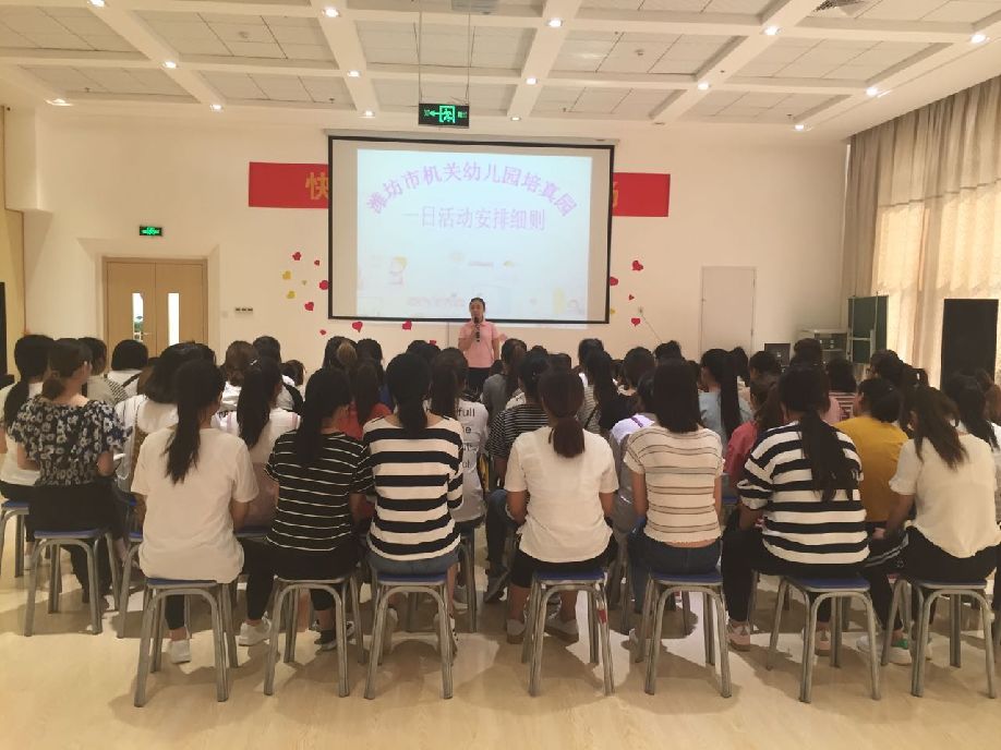 2017年5月31日,潍坊市机关幼儿园培真园接待了潍坊工程职业学院2015级学前教育系的跟岗实习学生们。 首先,学生们在多媒体学习了潍坊市机关幼儿园培真园的一日保教流程。其次班主任做了自我介绍。最后在班主任的引领下,80名实习学生分别进入了自己所分配的班级,进行为期3天的跟岗实活动。