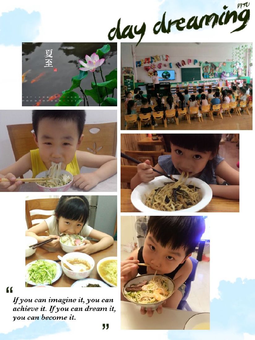 夏至是一年中最炎热的开始,也是白昼时间最长,夜晚时间最短的一天,夏至过后,白昼时间逐渐变短,夜晚时间变长。这都提醒着我们夏天真正的到来了。为了让幼儿感受夏至,了解夏至的风俗习惯,潍坊市机关幼儿园北海园开展了“快乐夏至”系列主题活动。 教师利用课件、图片和视频的形式,让幼儿了解夏至的风俗习惯和由来,知道了自古就有“冬至水饺夏至面”的说法,认识到了作为中国人更有义务传承自己的传统文化,这对树立民族意识具有非常深远的意义。 活动结束后,请幼儿回家跟爸爸妈妈一块吃凉面,感受夏至的炎热和风俗传统。