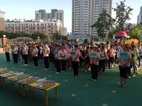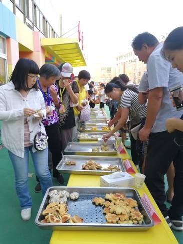 老师们巧妙地对桌椅进行摆放,将露天的品尝会布置得像一个野餐会,简洁而温馨。家长们步入园所,就看到桌上摆满了精心准备的12种美食,都是幼儿日常菜谱中常见的食物。有各种花式点心,如精肉锅贴、鸳鸯蒸饺、南瓜花卷、梅花酥、小鸭酥、双色开花馒头、麦穗包、西瓜馒头、蝴蝶卷、芙蓉同心卷、葡萄干发糕。有色、香、味俱全的美味菜肴,科学营养的搭配、细腻精巧的加工、咸淡适宜的口味赢得家长的一致认可。