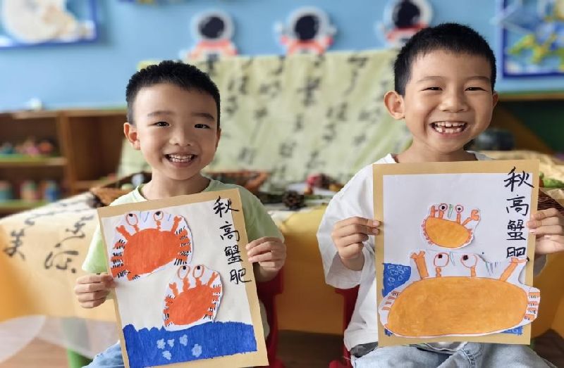 我们一起拿起画笔,勾勒出秋日池塘里横行的螃蟹;小心翼翼地压制树叶,制作成独一无二的自然标本;在种植区和活动角里,寻找秋天成熟的瓜果蔬菜,触摸南瓜粗糙的表皮,闻闻红薯甜甜的香气。