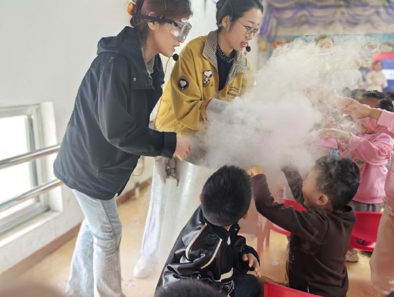 活动中,孩子们亲身感受了气体的神奇魔力。氮气与二氧化碳的奇妙变化,让小朋友们眼中闪烁着好奇的光芒,一连串的“为什么”接连不断地涌出。尤其是人造雨雾环节,当“氮氮队”与“碳碳队”各自展现独特变化时,孩子们更是全程兴致勃勃,探索的目光紧紧追随着实验现象。