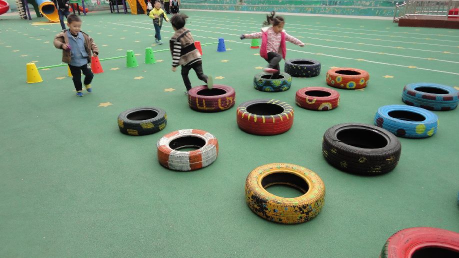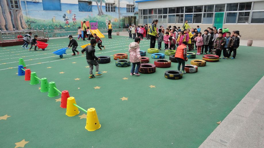 根据活动要求和幼儿不同年龄的兴趣特点,每个级部设计了丰富有趣的户外游戏,像小班的《皮球滚起来》、中班的《独轮车快快跑》、大班的《轮胎接力跑》等并对应活动器械提供各种游戏方案,孩子们玩的不亦乐乎。