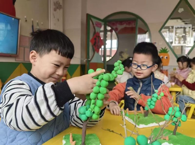活动中,老师们结合幼儿年龄特点,开展了不同的活动,其中在沉浸式的绘本共读中,孩子们透过画面感受生命生长的力量,理解绿色对地球的珍贵,心中悄然种下爱绿护绿的种子,实现了从视觉感知到心灵共鸣的升华;在手工创作环节中,孩子们化身绿色小匠人,用彩纸、黏土、树枝、落叶等材料,发挥奇思妙想制作绿植手作。有的折叠挺拔的小松树,有的捏出娇嫩的小花,有的拼贴出绿意盎然的森林,每一件作品都饱含童真与创意。在剪、折、粘、捏的过程中,孩子们不仅锻炼了动手能力与审美能力,更将对自然的喜爱倾注其中,把对绿色的期盼化作一件件可爱的作品,让环保理念从认知转化为具象的表达。